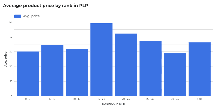 Furthermore, pricing data reveals how retailers are prioritising lower-price products within the PLP experience with the average price of products in position 1-5 being £30 compared to the average price of products in position 15-25 being £50.
