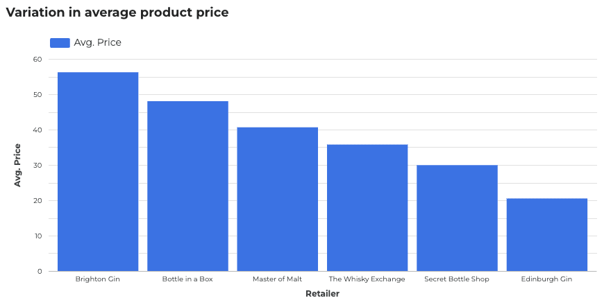 Across the six retailers included in the benchmark we see significant variation in product price with the range in average price by retailer extending from £20 at the lower end (Edinburgh Gin) to £55 at the higher end (Brighton Gin) but with the majority of products falling in the £30 - £40 price range.