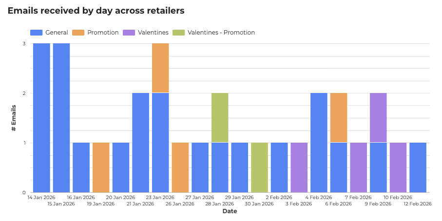 This throws the apparent lack of email marketing in the weeks preceding valentines day into sharp relief, despite registering and opting in to all email marketing communications we received minimal email volumes and there is little evidence to suggest that retailers have followed a clear strategy for capturing traffic in the week running up to valentines day.
