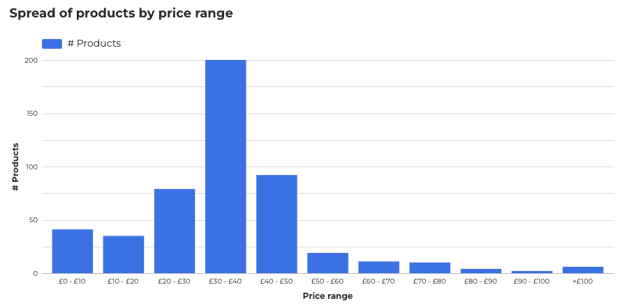 However, whilst there is significant variation in average price - indicative of a wide spread in product pricing across small gift boxes through to multi-70cl cases, when we look at the number of products by price range we see the majority of products fall in the £30-£40 range, similarly analysing price competitiveness across retailers suggests that most products fall within a relatively finite price window.