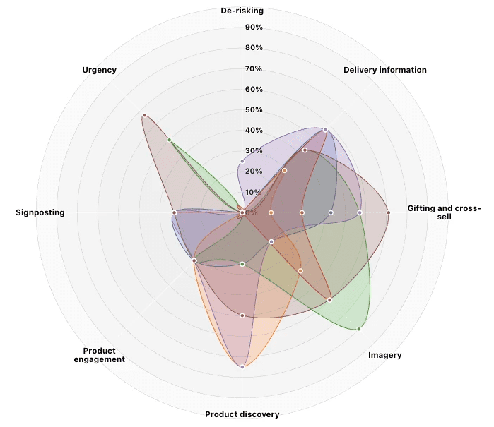 This focus of the customer experience on maximising sale rather than engagement is despite there being minimal customer engagement with purchase de-risking or use of urgency messaging, this suggests an approach to customer engagement that has been so heavily distilled that it now lacks key information required by users not only to find a product but also to inform and justify a purchase; there is minimal information regarding delivery, little use of urgency messaging and a general lack of effective product engagement across retailers included in the benchmark.