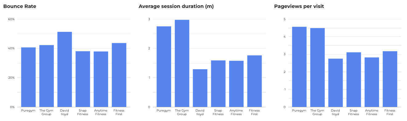 Although traffic volume has increase during peak, this is not necessarily associated with an improvement in customer engagement; bounce rate is consistent at c. 40% across gyms with average session duration being less than 2 minutes and pageviews per visit being approximately 3. This would suggest that gyms have failed to capitalise on the increase in traffic volume and customer awareness with a landing page experience that builds interest and engagement.