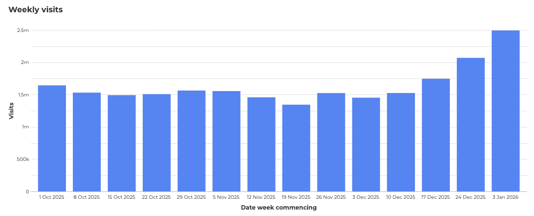Whilst traffic volume varies by gym chain, with PureGym receiving the most traffic (at c. 400K visits per week), there is consistent growth in traffic volume of about 30% in the weeks following Christmas, with David Lloyd seeing the greatest proportional increase in traffic at +40% compared to levels seen in October.