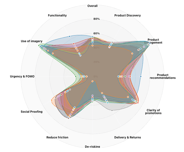 Across industry segments the benchmark reveals clear consistencies in customer experience with many retailers showing significant attention being paid to product engagement, imagery, social proofing and visibility of promotions. These are consistent with e-commerce best practices and indicate a high level of investment in optimisation.